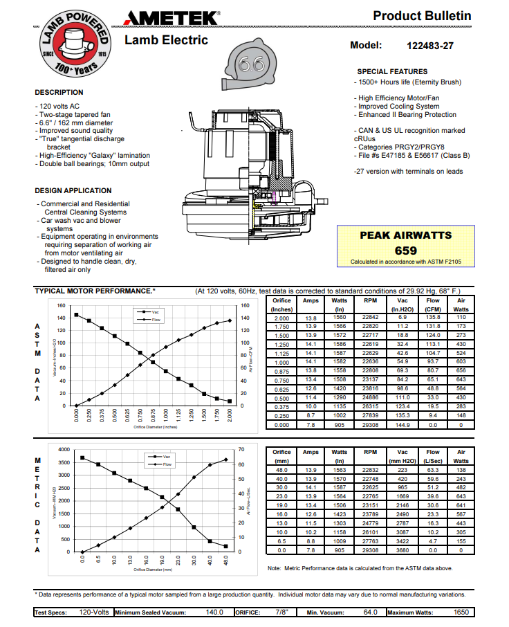 Ametek by-pass motor 122483-27 technical sheet (FM24832702)