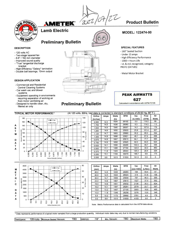 Fiche technique du moteur Ametek tangentiel (FM24742702)