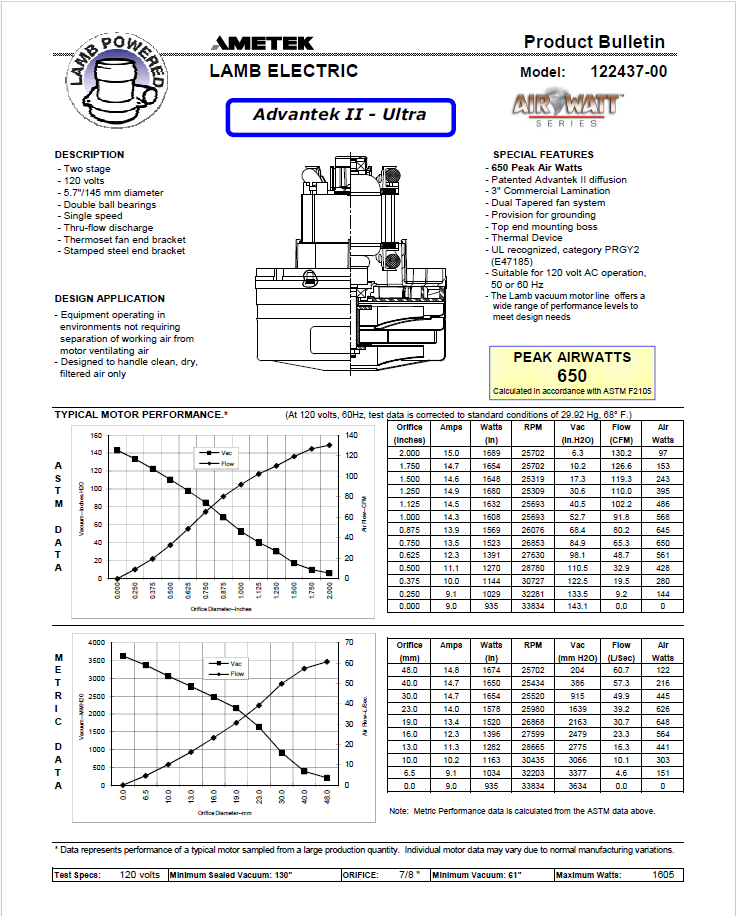 Moteur assemblé Ametek 122437 thru-flow 120v (FM24370001)